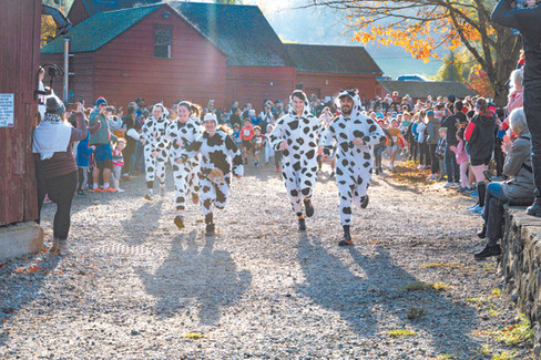 The 16th running of "Run the Farm," a 5-mile race, and "KIDS Run the Farm," were held at Muscoot Farm Sunday, Oct. 19. Total race finishers were 570 including 287 kids that ran in the two kids races. Top, the cows are the pacers that guide the kids races out into the trails at the start of the Kids Run the Farm first race. Next row, track team members make playful signs, and first racers of the day line up at the starting line. Bottom row, overall winner of the men's 5-mile race Eamonn Sullivan of Cold Spring. Overall winner of the women's 5-mile race Joelle Reeves of Brooklyn.